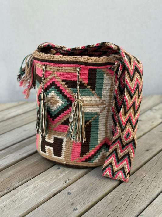 Carriel Wayuu – Colección Amanecer Dulce 🌸💙🤎 – (26x21 cm)