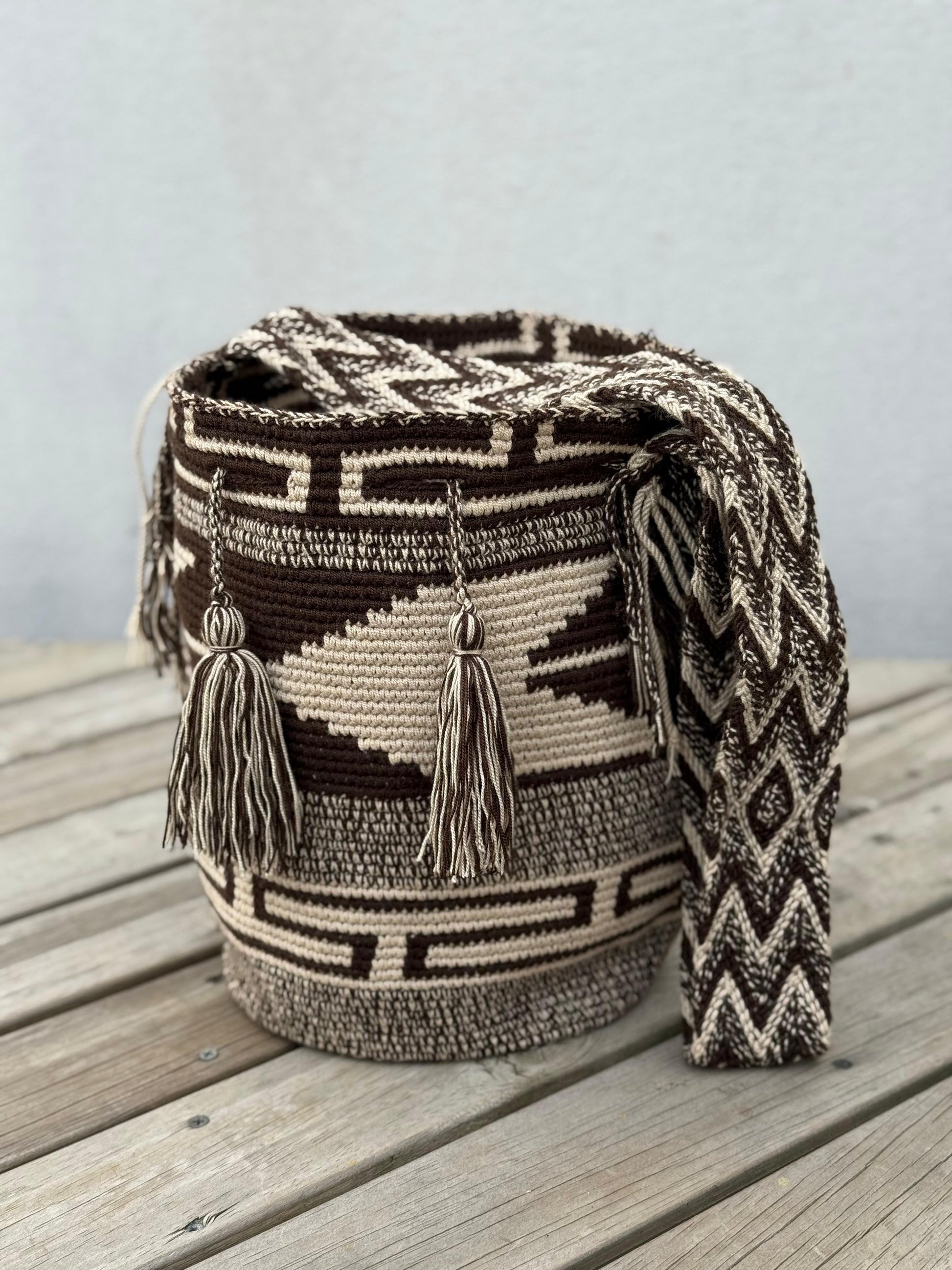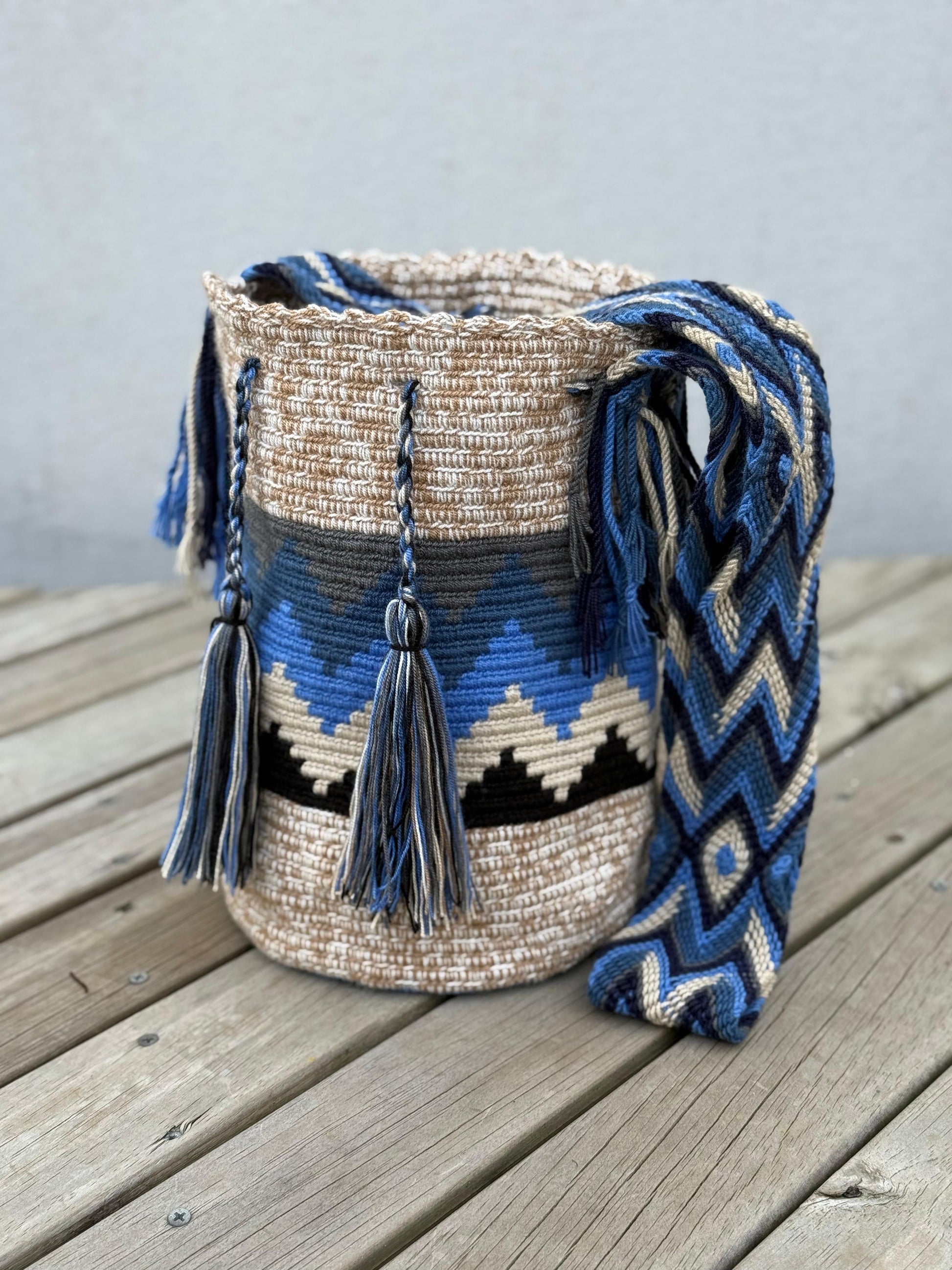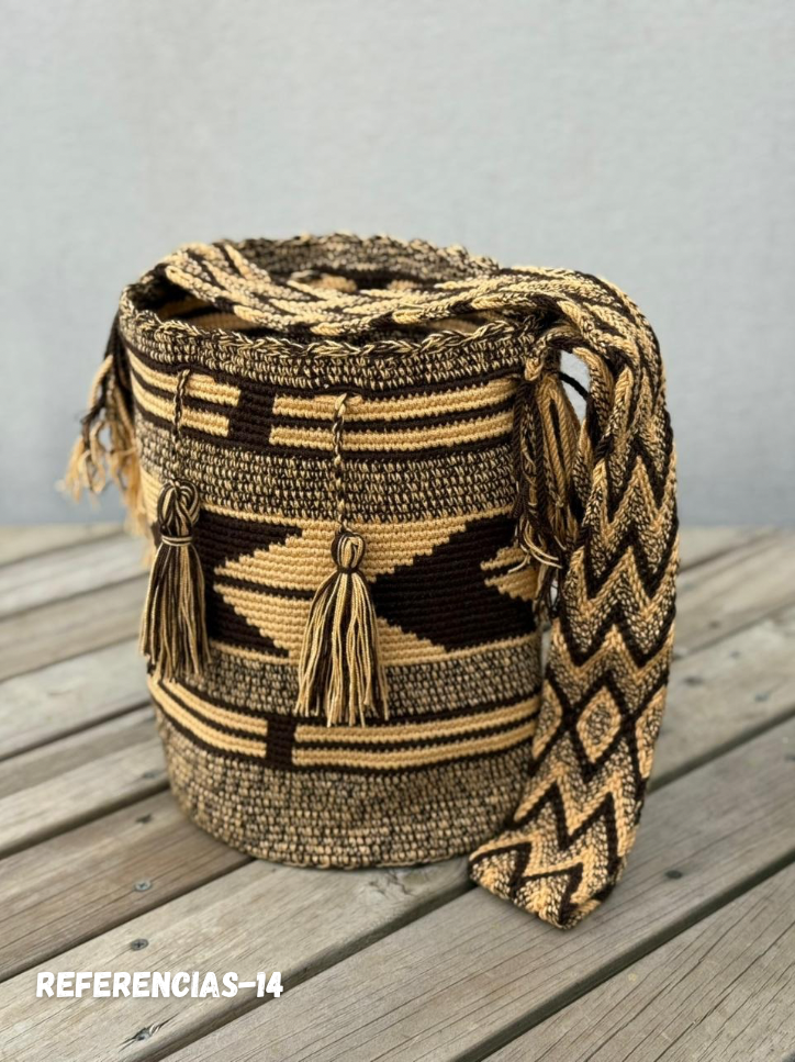 Mochila Wayuu 100% artesanal, tejida a mano por la comunidad indígena Wayuu, fusionando tradición y creatividad en cada diseño. Su diseño exclusivo Tonos Hombre combina colores sobrios como grises, azules, negros y cafés, logrando un estilo versátil, elegante y fácil de combinar para cualquier ocasión."