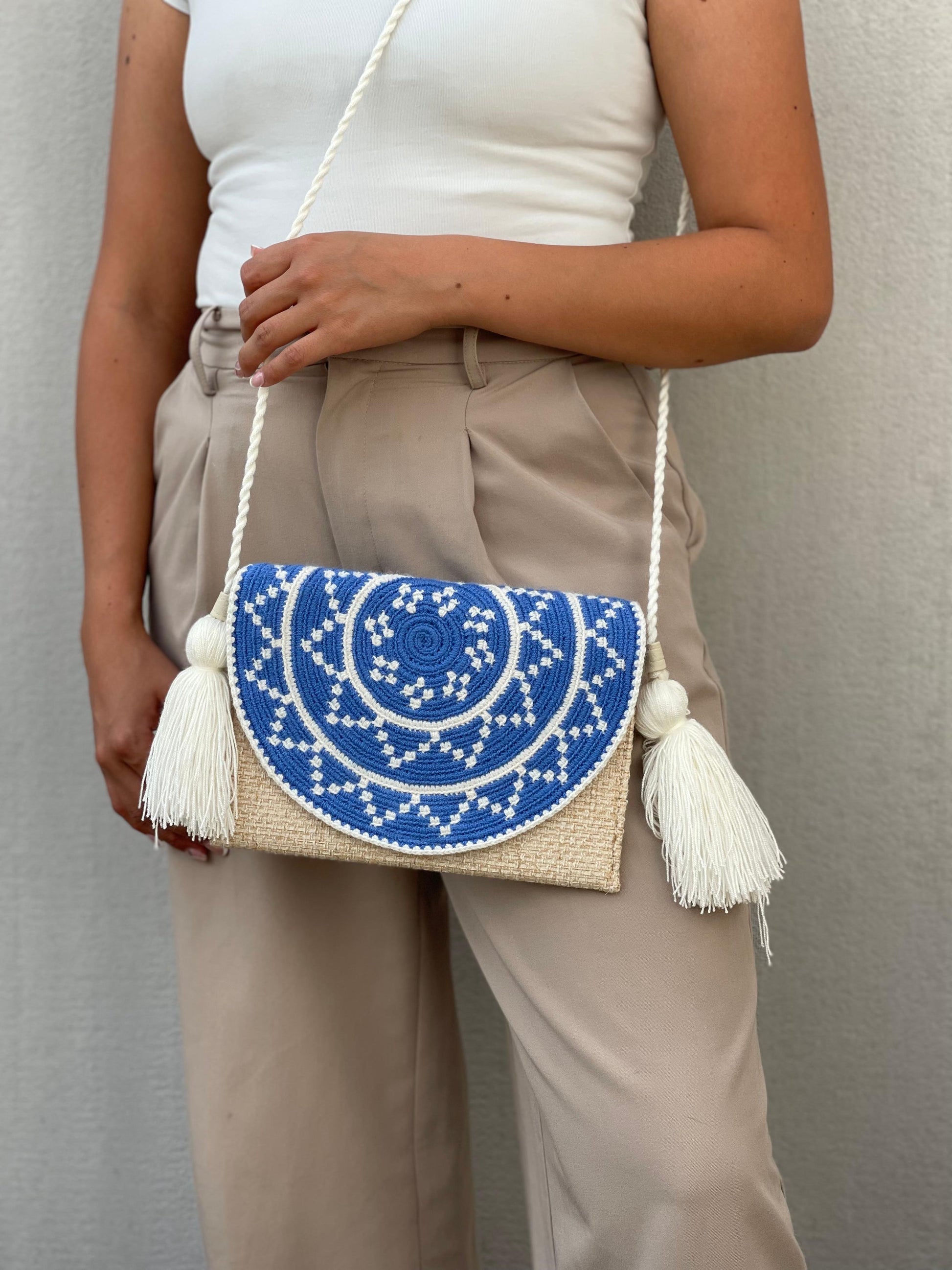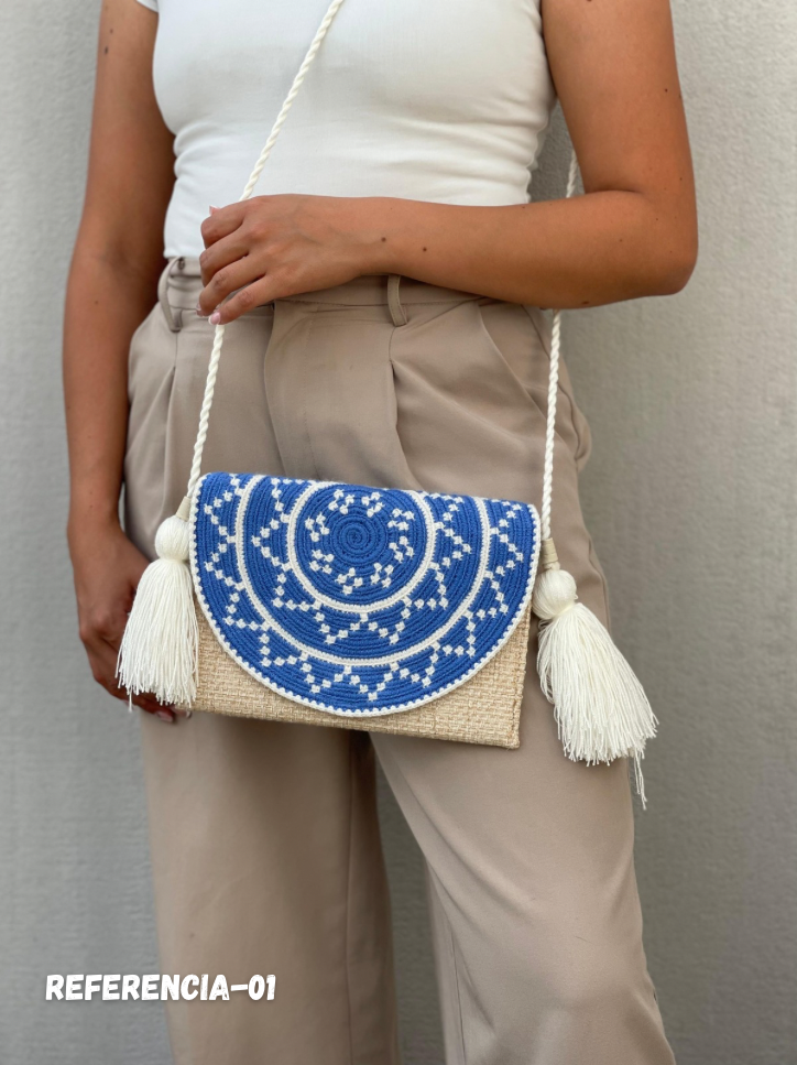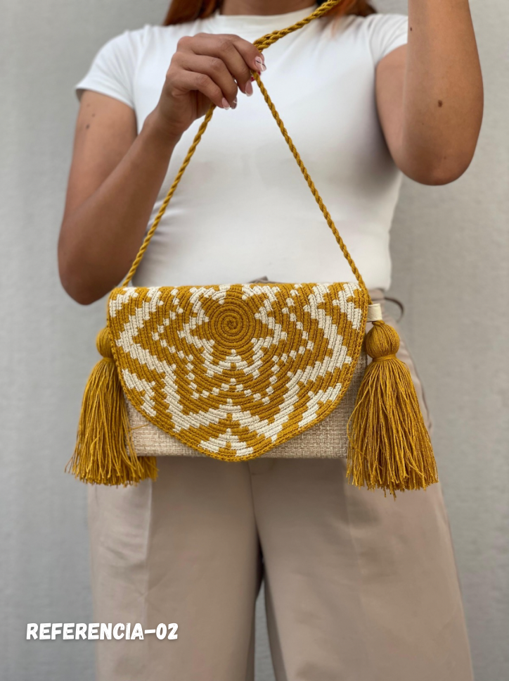 “Sobre artesanal elaborado a mano, combinando yute natural con tejido tradicional en hilo de algodón, logrando una pieza auténtica que resalta por su textura, carácter y estilo artesanal. Su diseño equilibra lo rústico y lo sofisticado, convirtiéndolo en un accesorio versátil y lleno de personalidad.”